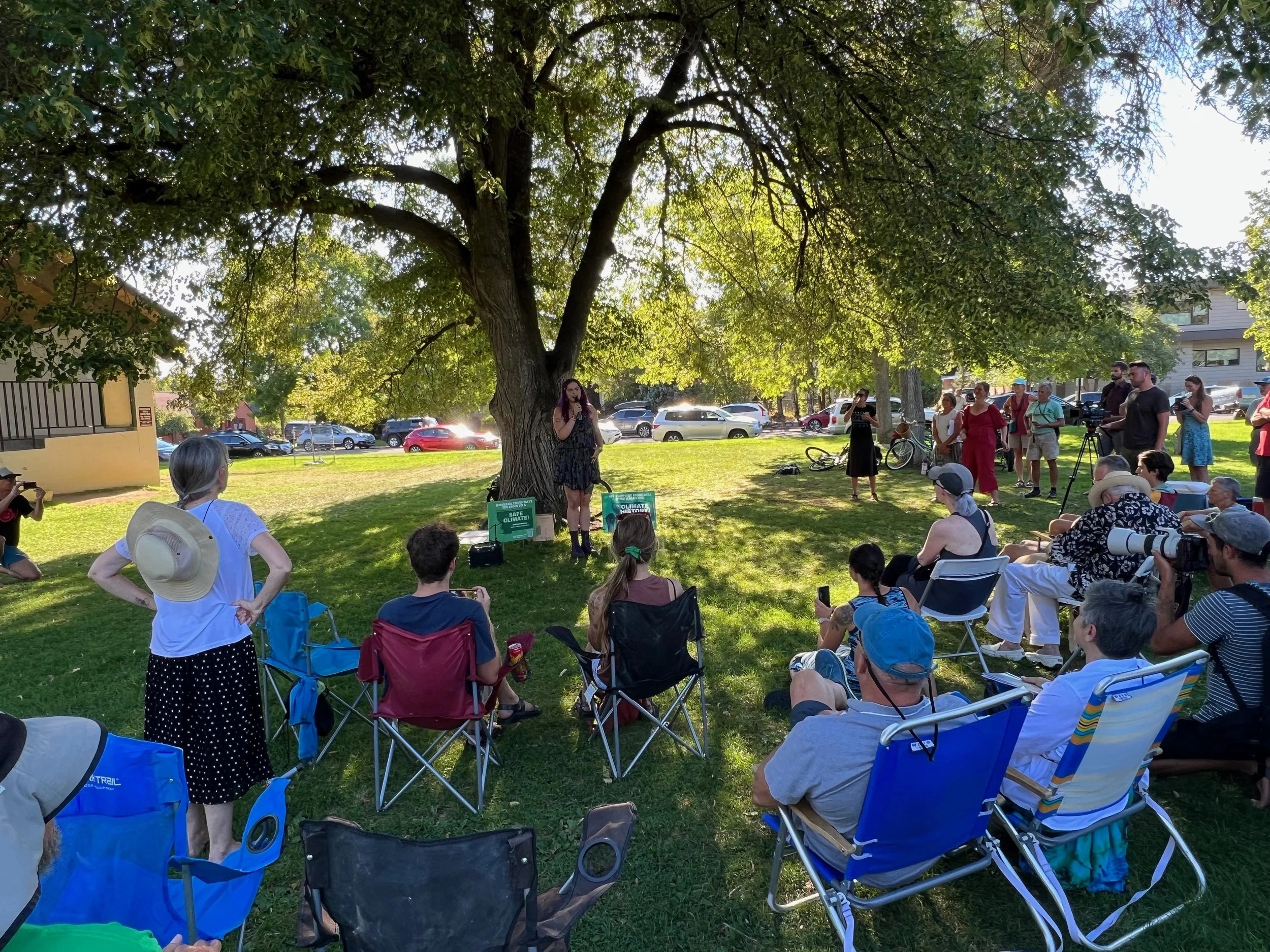 With the sun still hours from setting, I departed and drove to the city park occupying a square block in a tree filled neighborhood of middle class homes and traffic circles. Approximately 50 - 75 people from a number of supporting groups gathered in the dry heat of a 103F late afternoon on August 15th to hear Olivia and Micah speak under the sheltering shade of an elderly oak. Both thanked the folks in the crowd for their support and spoke of the gratifying nature of a long sought victory.